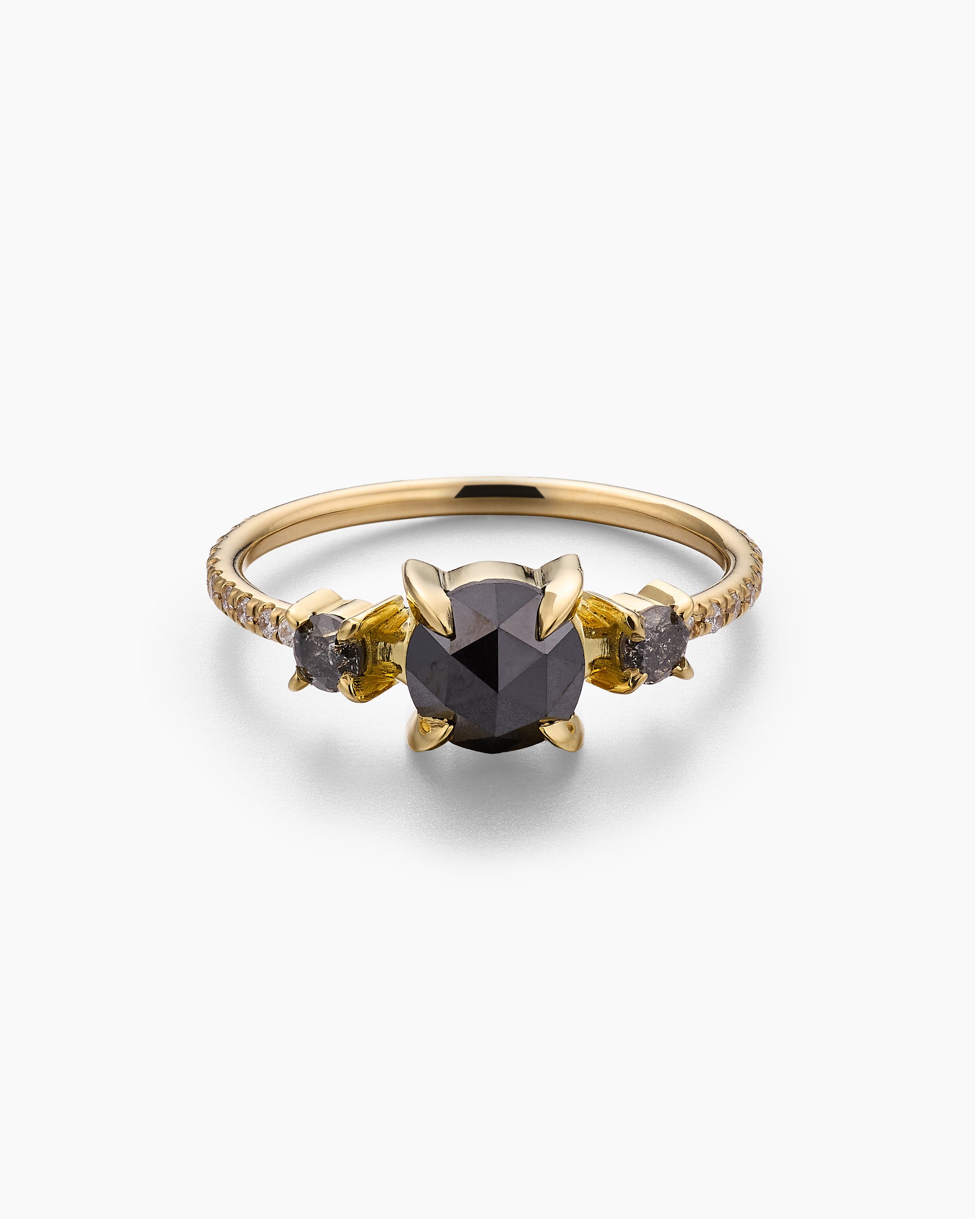 6.17 mm Round Black Rose Cut Diamond with Two 2.8 mm Round Salt and Pepper Side Stones and 24 points Pavé set in 18k Yellow Gold. Size 7 (sizable)