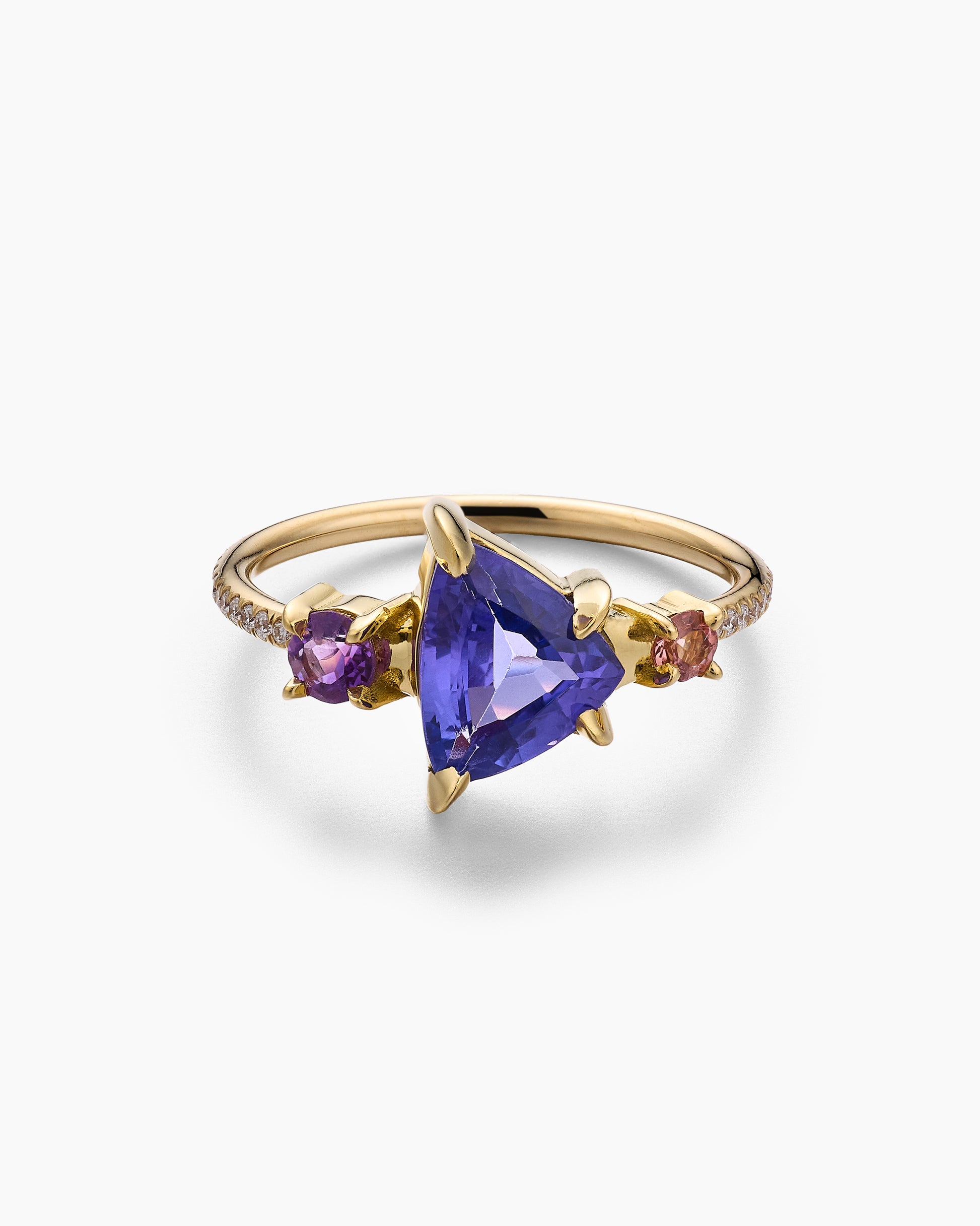 Tanzanite with Amethyst, and Sapphire Side Stones and 26 points Pavé. Set in 18k Yellow Gold Size 6 (sizable)